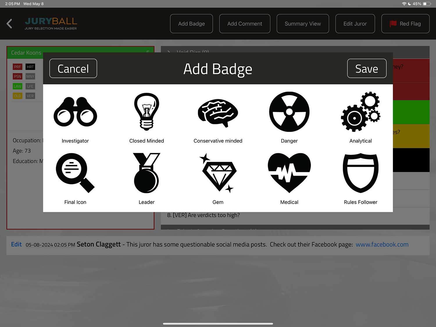 - Store comments about each juror in real-time and have conversations about jurors with peers, all within the app
